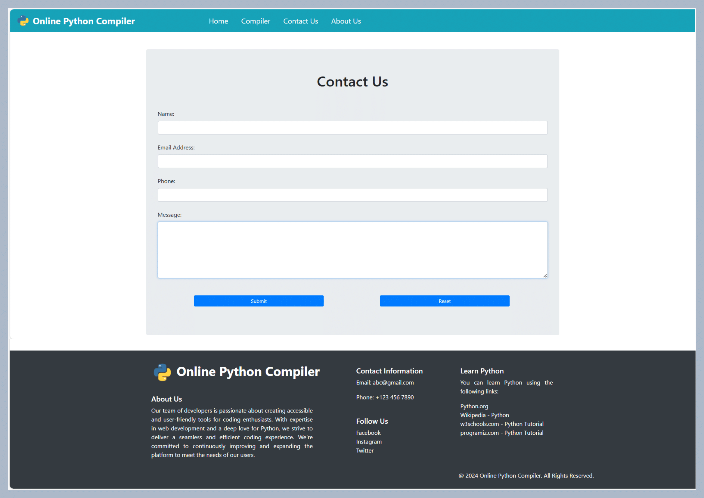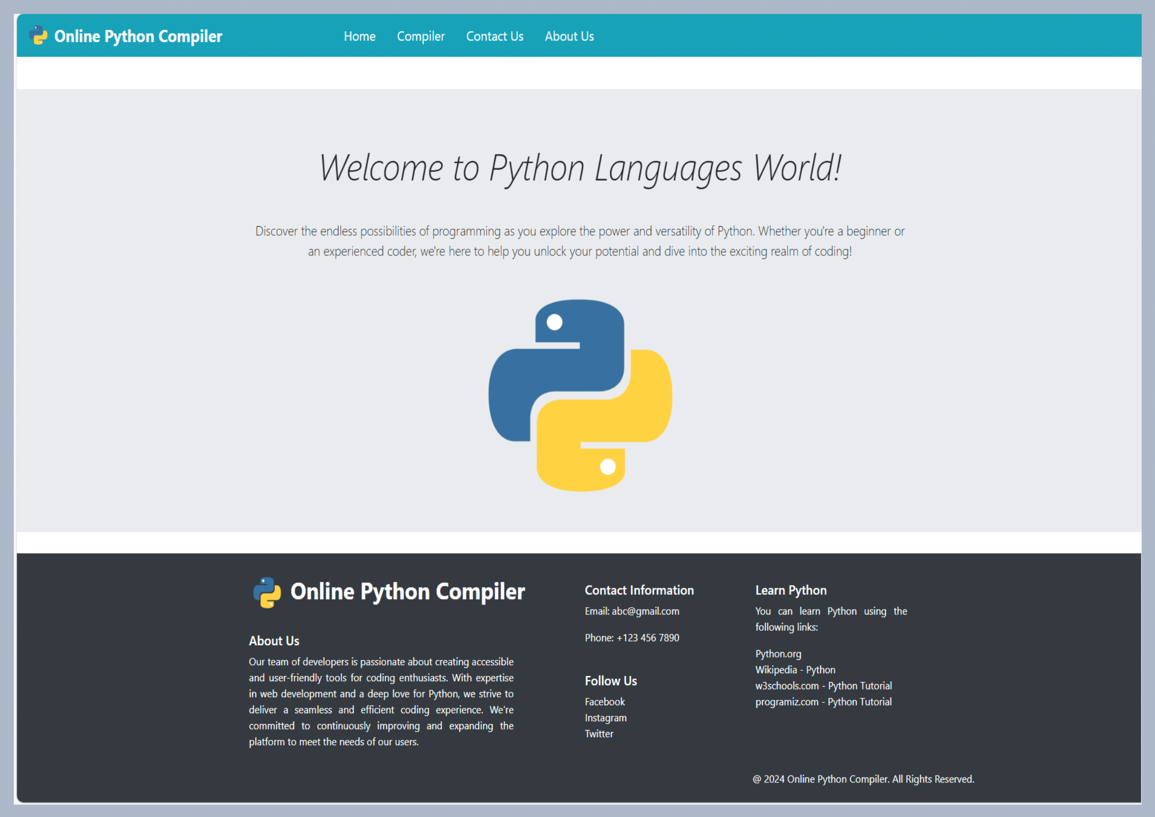 The Online Python Compiler Is A Web-based Platform Designed To Allow Users To Write And Run Python Code Directly Within Their Browser, Without The Need For Any Local Installations. This Platform Built With Python, Django, HTML, CSS, JavaScript, And Bootstrap, It Provides A Simple And Intuitive Coding Environment.