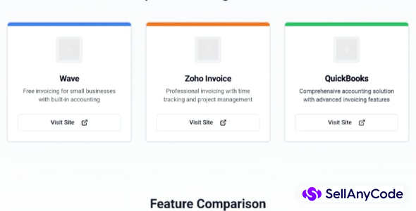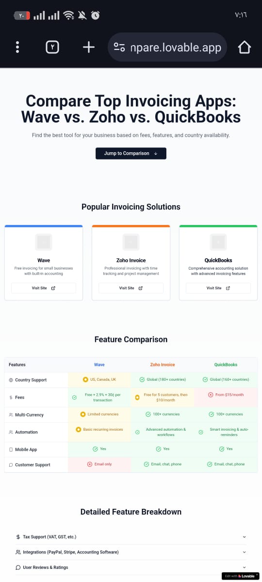 A Sleek, Responsive Landing Page Template Comparing Top Invoicing Apps (Wave, Zoho, QuickBooks, FreshBooks) With Feature Tables, Country Support, And Fee Breakdowns. Perfect For SaaS Reviewers, Affiliate Marketers, Or Finance Blogs.