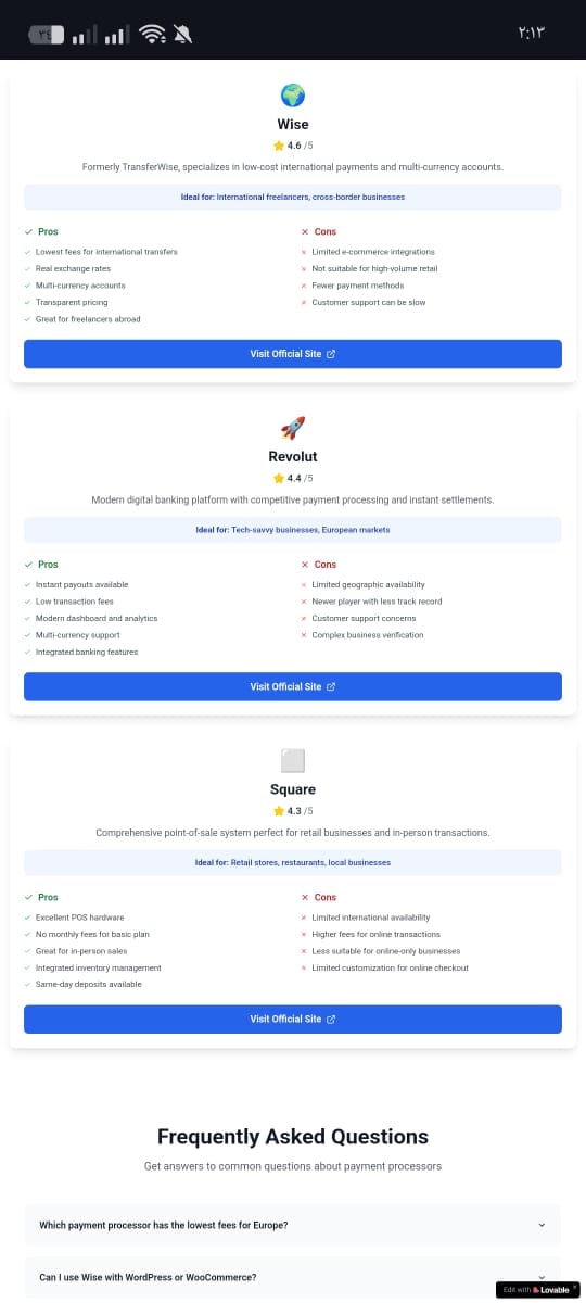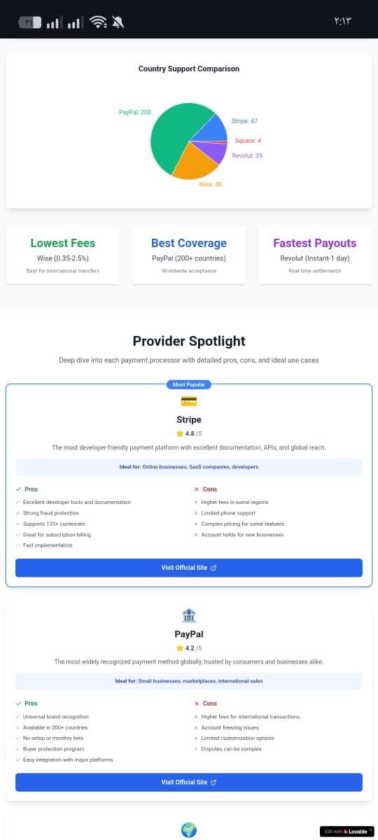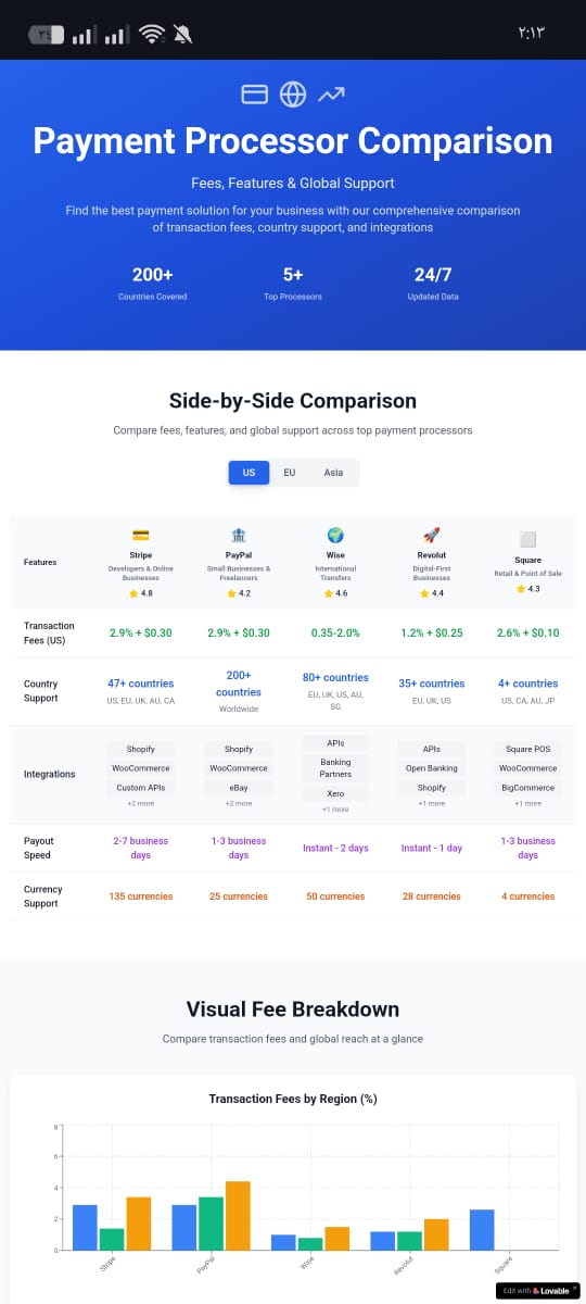 A Sleek, Responsive Landing Page Template Comparing Stripe, PayPal, Wise, And Revolut By Fees, Country Support, And Integrations. Perfect For SaaS, Fintech Blogs, Or Affiliate Marketers.