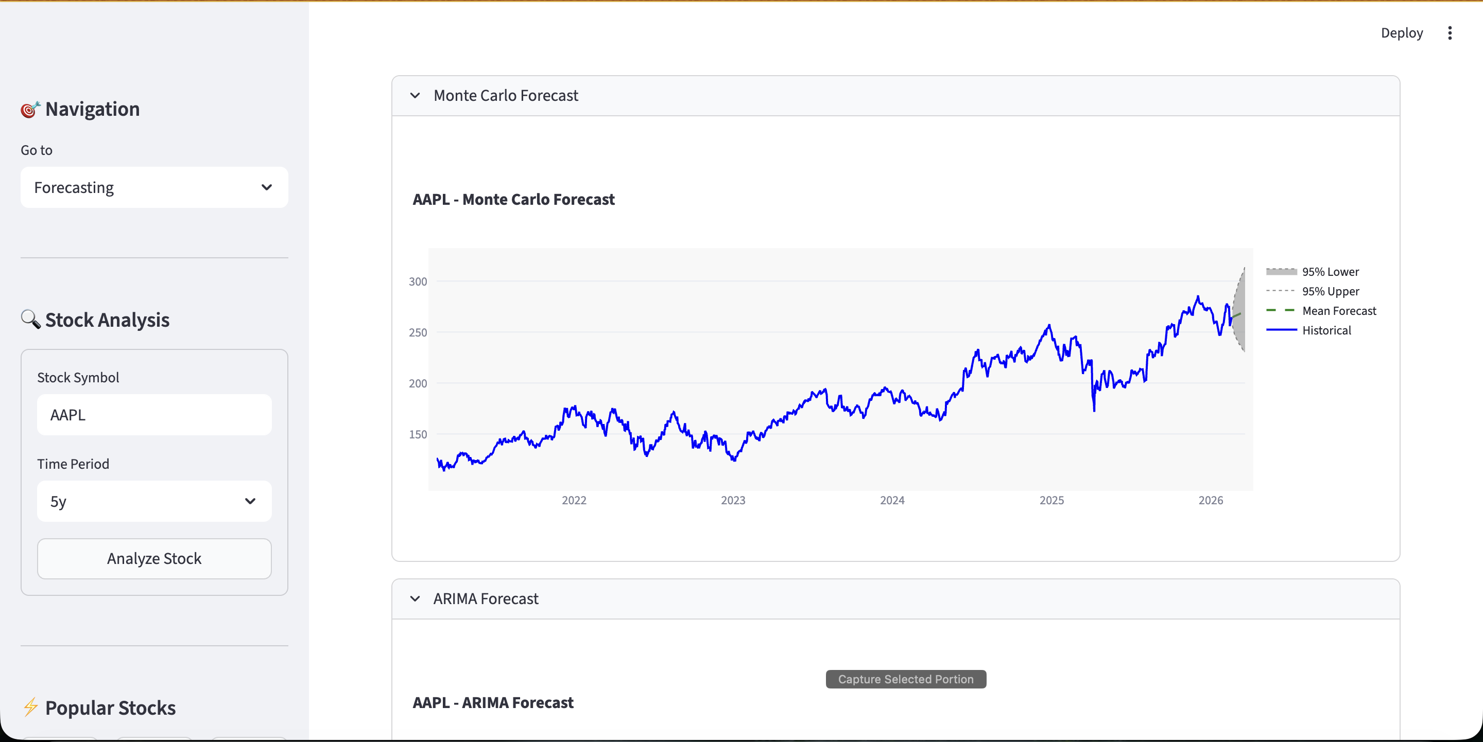 Dive Into The US Stock Market With StockMaster Pro, A Robust Python-based Dashboard Built On Streamlit And Yfinance. This All-in-one Platform Empowers Users To Analyze Stocks Like A Profetch Real-time Data, Compute Advanced Technical Indicators (RSI, MACD, Bollinger Bands, Stochastic, ATR, And More), Visualize Interactive Charts, And Generate Multi-model Forecasts (Linear Regression, ARIMA, Monte Carlo Simulations) For Informed Decisions.