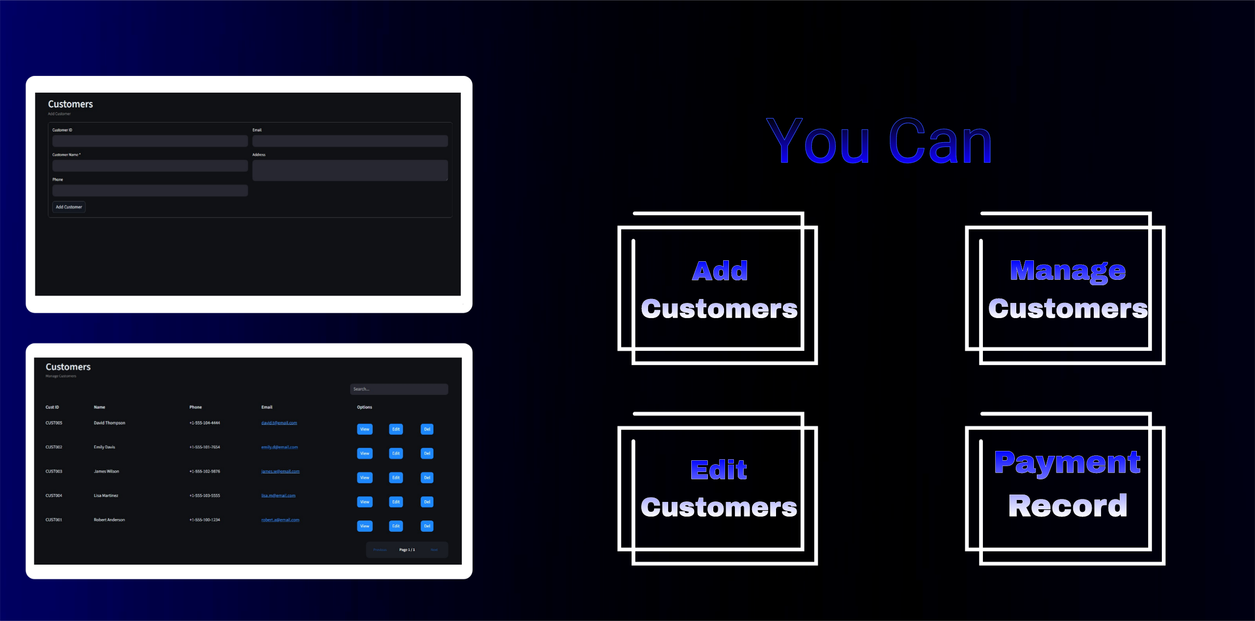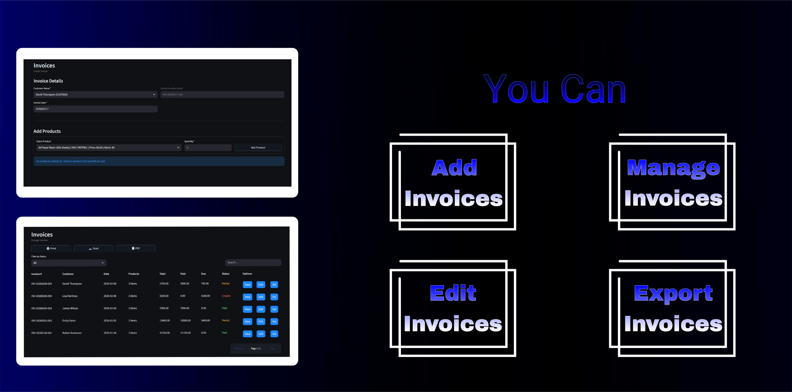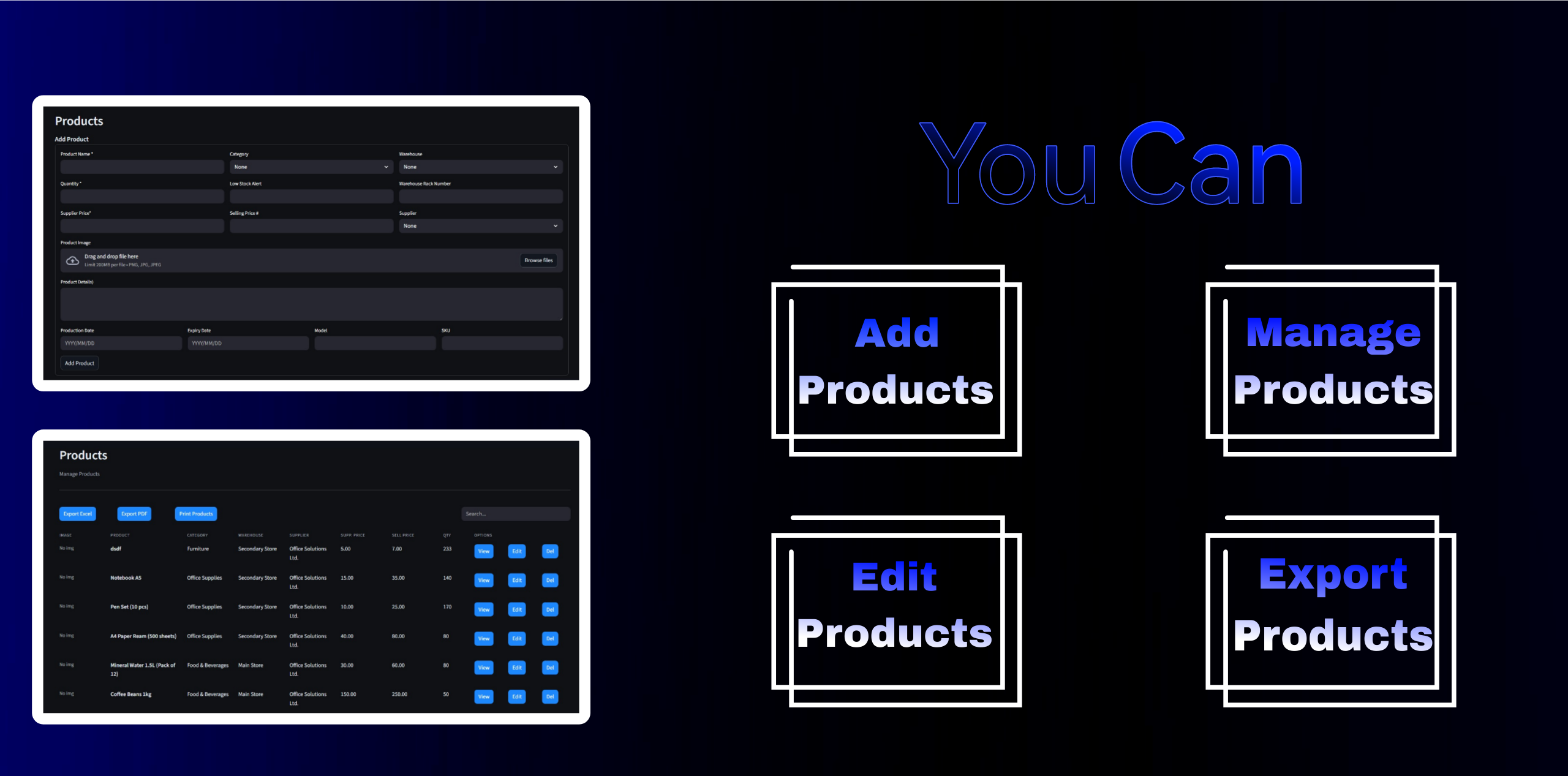 • Add, edit, delete, search products