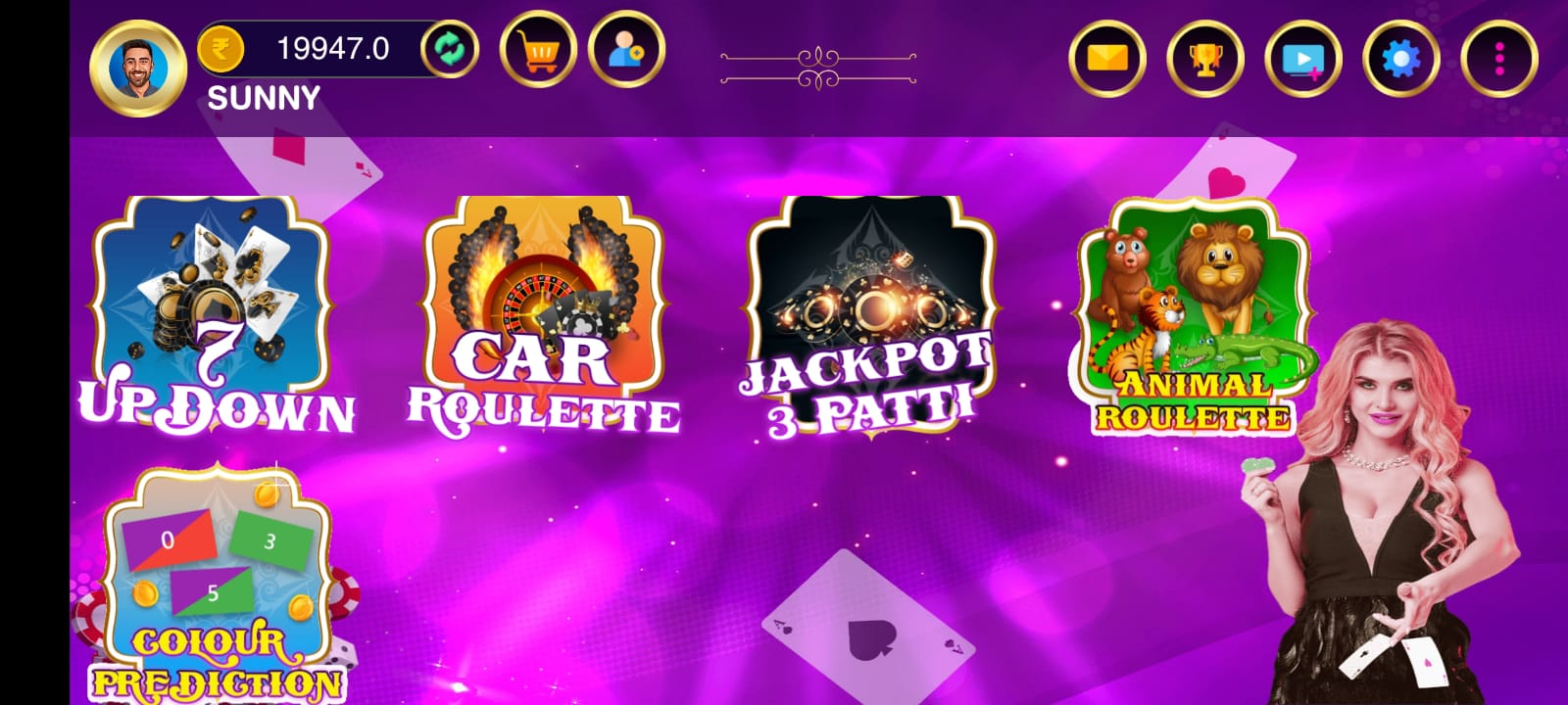 All In One Game Have 9 Games Of Collections Still Our Team Is Working To Add More Games Here. All These Games Are Cards Games. It Has Teen Patti, Rummy, Andar Bahar, Dragan Vs Tiger, 7 Ups Down, Car Roulette, Jackpot 3Patti, Animal Roulette, Color Prediction